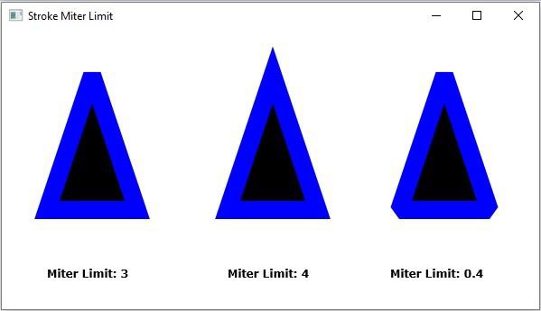 Stroke Miter Limit 属性指定/定义了 StrokeLineJoin.MITER 样式中笔划线连接的限制。可以使用 javafx.scene.shape.Shape 类的 setStrokeMiterLimit() 方法设置此值。