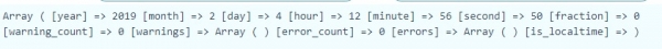Array ( [year] => 2019 [month] => 2 [day] => 4 [hour] => 12 [minute] => 56 [second] => 50 [fraction] => 0 [warning_count] => 0 [warnings] => Array ( ) [error_count] => 0 [errors] => Array ( ) [is_localtime] => )