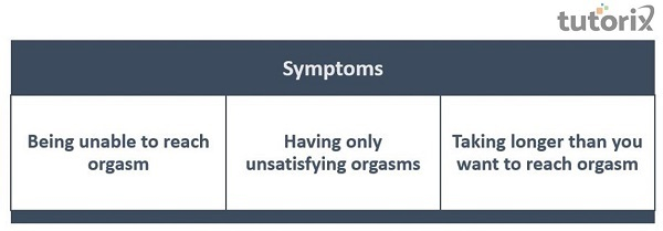 三个常见的症状表明女性性高潮功能障碍:无法达到性高潮、达到性高潮的速度比预期慢,或伴侣之间或独自一人时性高潮不适。许多因素都会影响女性达到性高潮的难度。无法达到性高潮会导致痛苦,这使得将来更难以达到性高潮。患有性高潮功能障碍的女性可能难以在性交或自慰时达到性高潮。