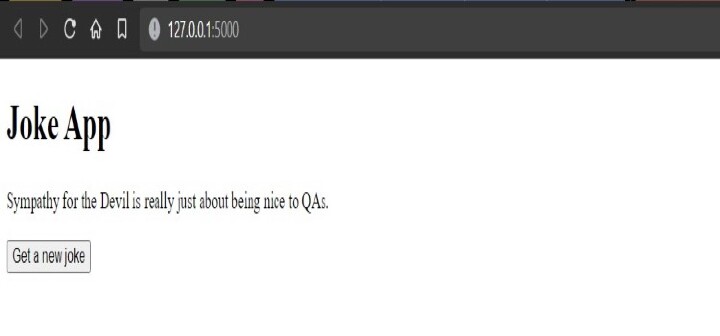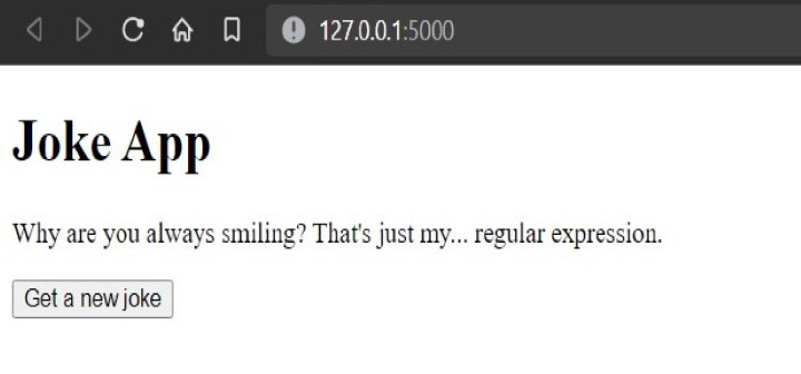 jokes.html 模板是一个基本的 HTML 文件,它使用 Jinja2 语法渲染从 Flask 应用程序传递的 joke 变量。页面的标题设置为“笑话应用”,标题也是“笑话应用”。笑话使用 **{{ joke }}** 语法显示,它是 joke 变量的占位符。最后,包含一个“获取新的笑话”按钮以 **重新加载** 页面并生成新的笑话。