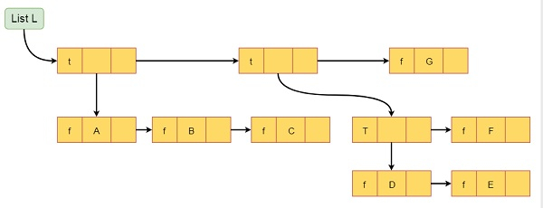 };因此,如果标记为真,则由节点表示的元素是一个子列表。down 指向子列表中的第一个节点。如果标记为假,则该元素为原子。next 指针指向列表中的下一个元素。列表将如下所示。