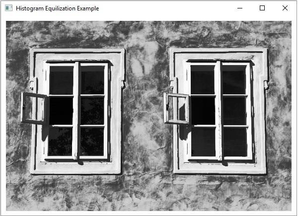 Imgproc 方法的 equalizeHist() 方法接受表示源图像和目标图像的 Mat 对象,均衡源矩阵的直方图并将其接收在目标矩阵中。