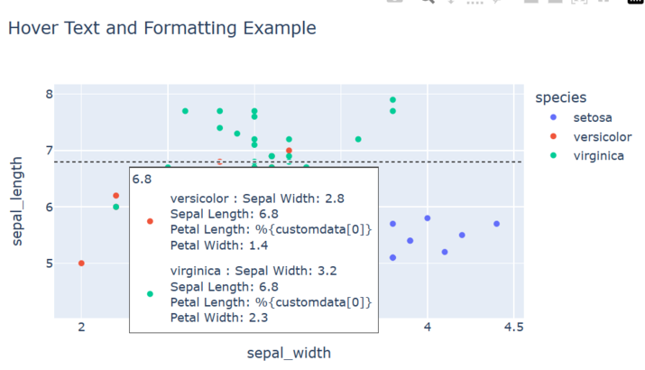 运行此程序时,您应该会看到一个萼片宽度与萼片长度的散点图,其中点根据物种颜色区分。当您将鼠标悬停在某个点上时,悬停文本将显示该数据点的萼片宽度、萼片长度、花瓣长度和花瓣宽度。y 轴悬停文本将为每个数据点显示格式化的萼片长度值。