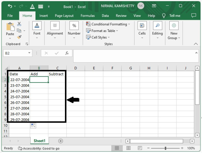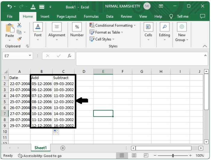 在这里,我们将首先使用公式获取第一个结果,然后使用自动填充柄完成任务。让我们看看一个简单的过程,在 Excel 中从日期列表中添加或减去给定的时间。