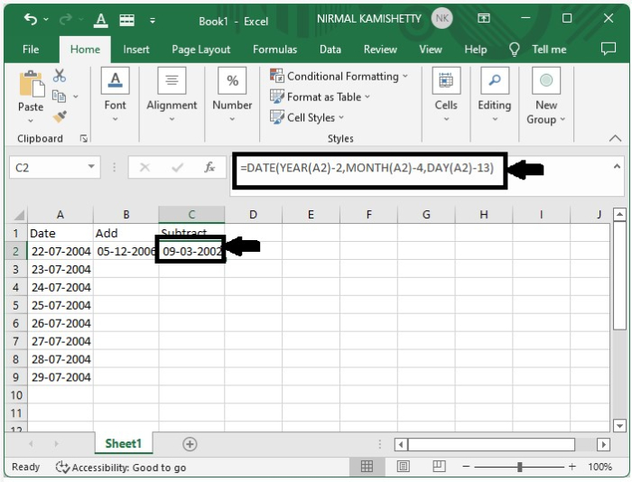 在我们的例子中,要添加或减去 2 年 4 个月 13 天,公式将是 -