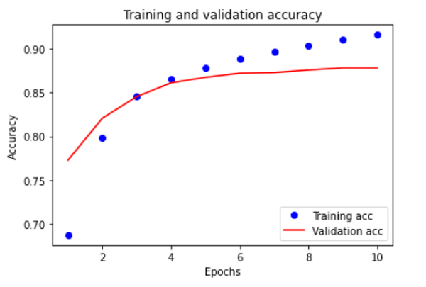 以下是创建可视化训练和验证准确度图表的代码片段,用于训练过的 IMDB 数据集: