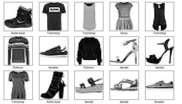 plt.figure() plt.imshow(train_images[0]) plt.colorbar() plt.grid(False) plt.show() train_images = train_images / 255.0 test_images = test_images / 255.0 plt.figure(figsize=(12,12)) for i in range(15): plt.subplot(5,5,i+1) plt.xticks([]) plt.yticks([]) plt.grid(False) plt.imshow(train_images[i], cmap=plt.cm.binary) plt.xlabel(class_names[train_labels[i]]) plt.show()
