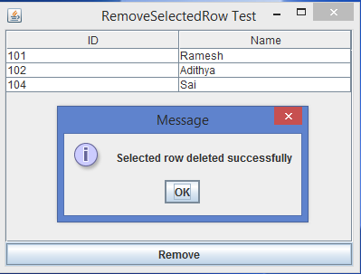 JOptionPane.showMessageDialog(null, "Selected row deleted successfully");