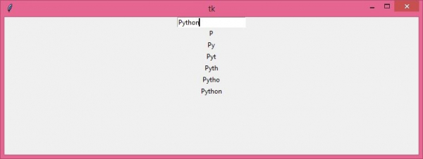 运行以上代码将在文本 Label 上打印 Entry 小工具的输入字符。现在,在给定的 Entry 小工具上输入一些内容,以便在 Label 小工具上回显输入事件。