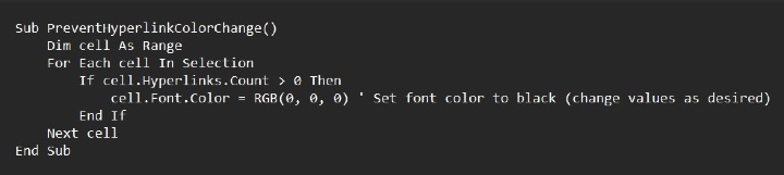 VBA 代码迭代指定范围内的每个单元格,将包含超链接的单元格的字体颜色更改为黑色。要更改字体颜色,请更改代码中的 RGB 值。