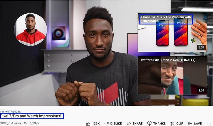 Marques Brownlee 通过结束屏幕(如此处所示)引导他的观众从一个视频到另一个主题类似的视频 -