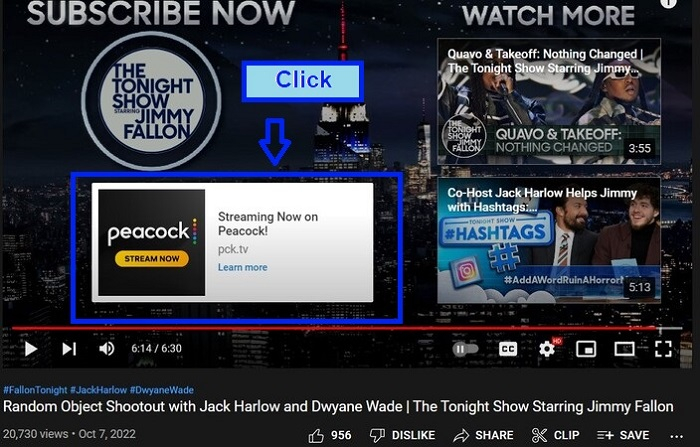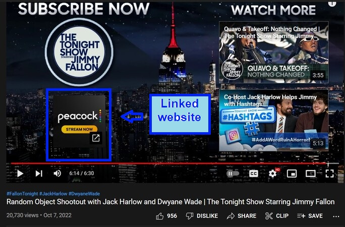 您还可以链接另一个 YouTube 频道。链接的结束屏幕允许您添加指向您自己网站的链接。YouTube 也提供了一个设置关联网站的过程。此外,在使用 YouTube 设置您自己的网站后,您也可以将观看者引导到网站上。它可以通过重定向来链接。您还可以将您的观看者引导到您的新 YouTube 频道,从而增加该频道的订阅者。吉米·法伦的《今夜秀》在结束屏幕上推广了孔雀网站。