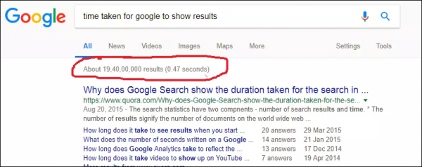 当我在 Google 中搜索“Google 显示结果所需时间”的问题时,在 0.47 秒内获得了 19,40,00,000 个结果。