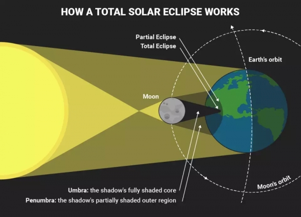日全食:当从地球上看,月亮完全遮挡住太阳时发生。该阴影区域经历日全食。