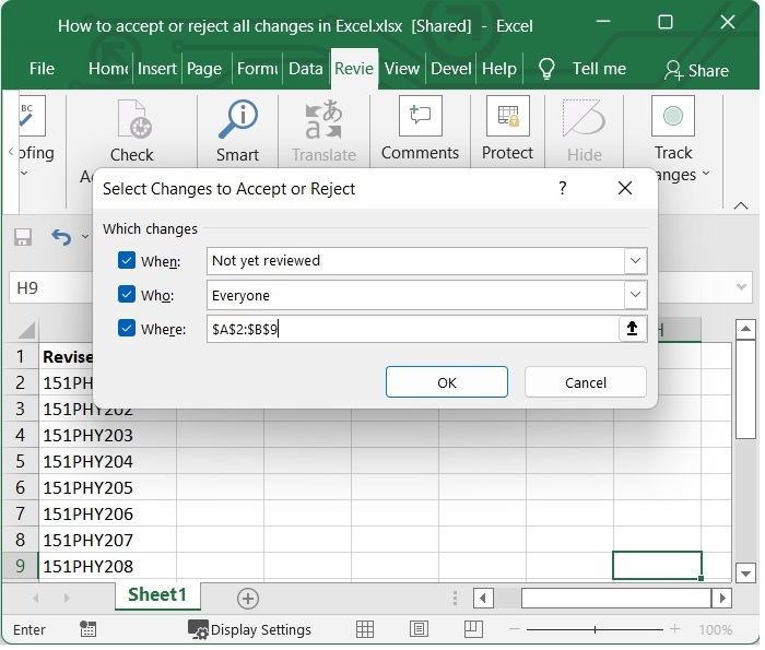 您或其他人对工作表进行了编辑后,您可以通过打开工作簿并从下拉菜单中选择“审阅>跟踪更改>接受/拒绝更改”来访问“选择要接受或拒绝的更改”框。查看此屏幕截图: