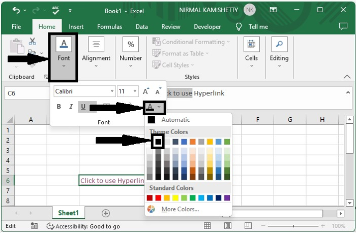 现在单击单元格并选择您不想用作超链接的数据,然后单击字体并将字体颜色更改为黑色。