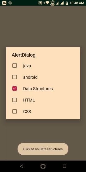 Toast.makeText(MainActivity.this, "Clicked on Data Structures", Toast.LENGTH_LONG).show();
