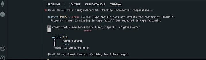 Type 'Animl' does not satisfy the constraint 'Animal'. Property 'name' is missing in type 'Animl' but required in type 'Animal'.