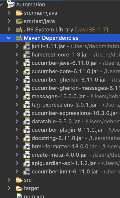 步骤 4− 单击项目中的 Maven Dependencies 文件夹。我们通过 Maven 获得的所有与 Cucumber 相关的依赖项都应可见。