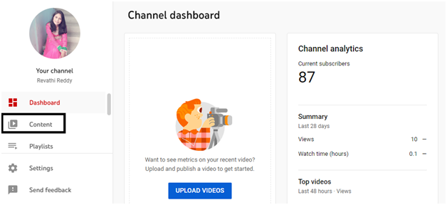 - 步骤 3 − 您将进入频道信息中心页面。在左侧菜单中,您会找到内容选项卡。点击内容。