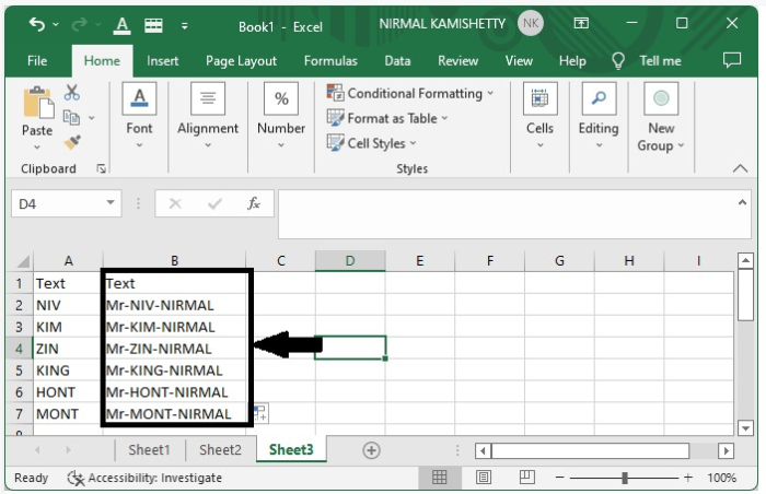 现在,单击您想要获取结果的空单元格,并输入公式 ="Mr-"&A2&"-NIRMAL "并按 Enter 以获取第一个结果,如下所示