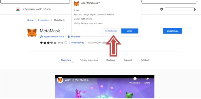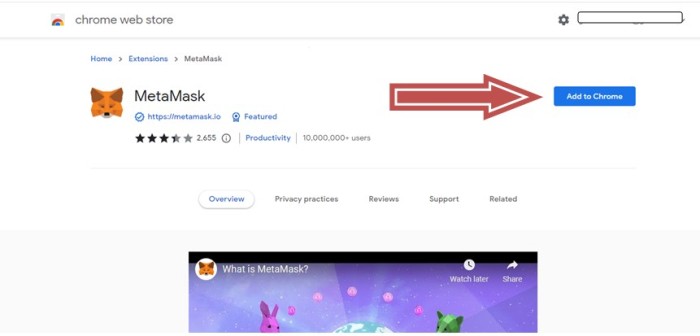 **步骤2** - 点击Chrome下载后,它会将您带到一个谷歌扩展程序页面,您可以在其中添加MetaMask扩展程序。