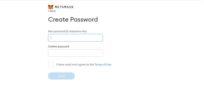 **步骤5** - 输入一个新密码,然后再次输入相同的密码进行确认。完成后,点击**使用条款**框,然后点击**创建**。