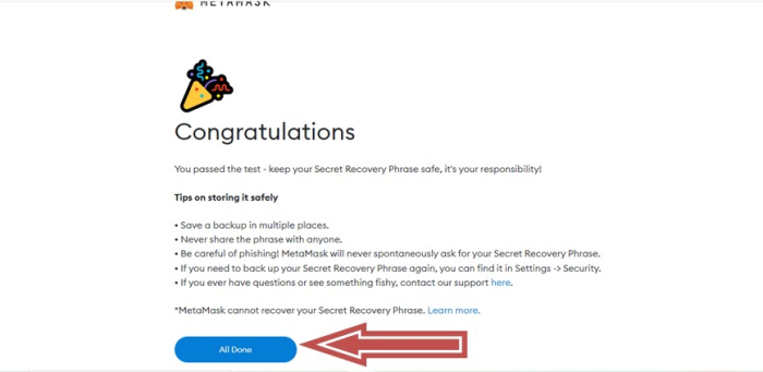 **步骤7** - 在账户创建过程中输入恢复密钥进行验证后,您的钱包设置就完成了。