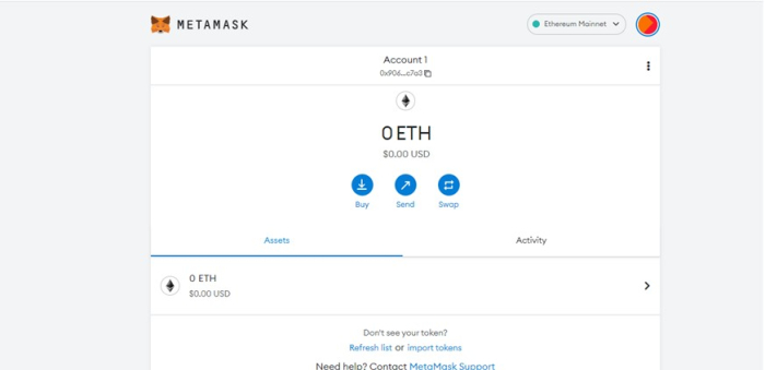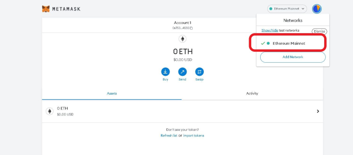 **步骤1** - 创建账户后,您会注意到您只有一个可用网络,即**以太坊主网**,如下图所示。