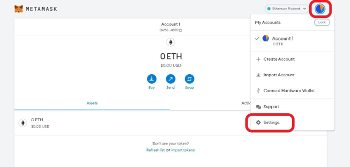 **步骤2** - 要设置或获取测试网络,请**点击您的账户头像**,然后**点击设置**。如下图所示。