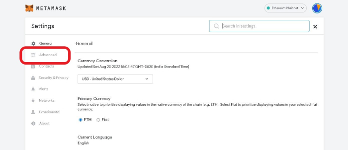 **步骤3** - 点击设置后,钱包的另一个部分将打开,在这里**点击高级**。