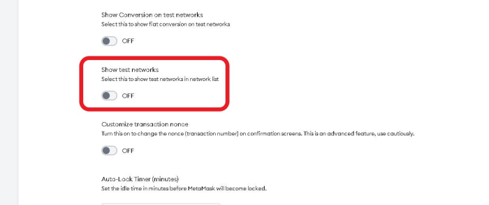 **步骤4** - 在**高级**部分向下滚动,您会看到一个滑块,它可以在钱包中启用测试网络。点击它以打开测试网络。