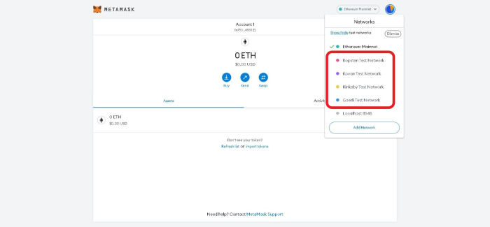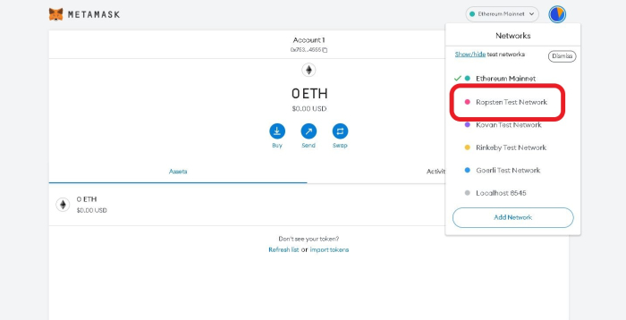 **步骤6** - 选择**Ropsten网络**(我们在本文中使用此网络进行演示,因为所有其他网络都有类似的过程)。