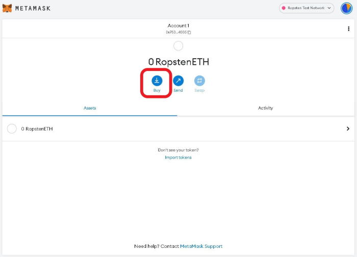 **步骤7** - Ropsten测试网络出现在屏幕上后,**点击蓝色“购买”选项卡**。