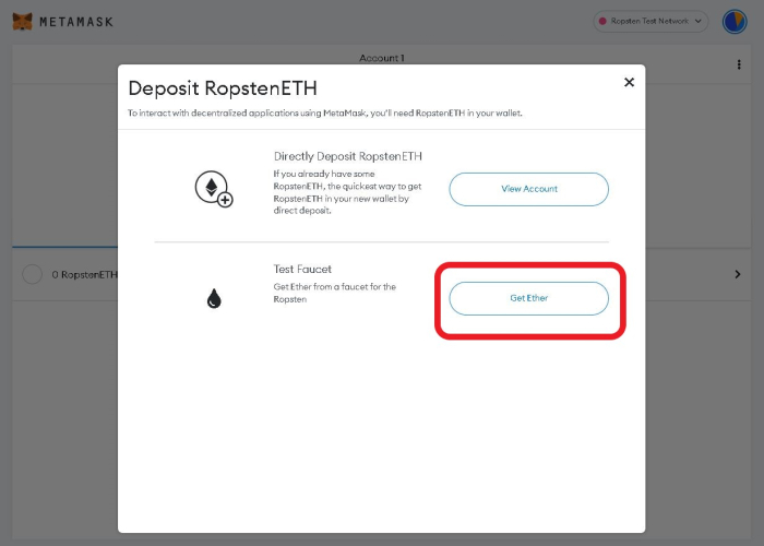 **步骤8** - 将弹出一个窗口以存款RopstenETH和测试水龙头。**点击****测试水龙头**选项卡,这将跳转到https://faucet.metamask.io/