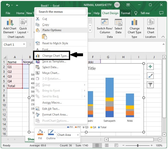现在,右键单击图表区域,然后从菜单框中选择“更改图表类型”。