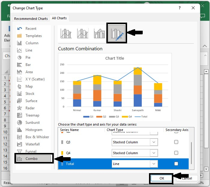 将显示一个弹出菜单。从左侧下拉列表中选择“组合”,选择“自定义”,并将除“总计”以外的所有类型设置为“堆叠柱状图”,并将“总计”设置为“折线图”,如下图所示。