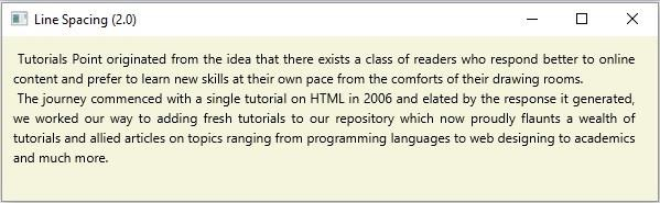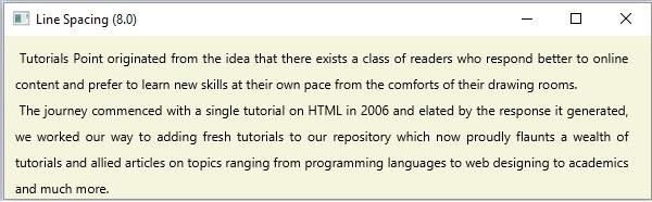 javafx.scene.text.Text类的行间距属性指定文本(节点)各行之间的行间距(垂直)。