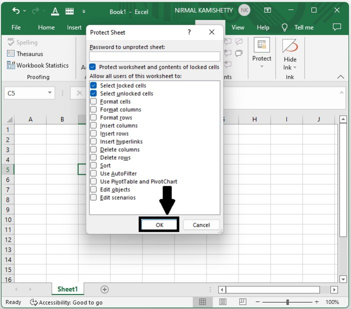 现在单击“确定”,然后弹出窗口将关闭,再次单击“确定”以确认密码并单击“确定”,然后再次单击“保护工作表”,并单击“确定”以关闭弹出窗口并应用保护。