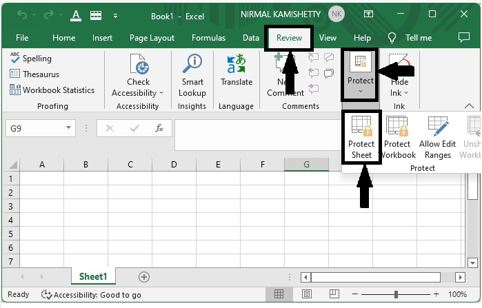 要使工作表受保护,请单击快速访问工具栏上的“审阅”,然后选择“保护”,然后单击“保护工作表”以打开一个弹出窗口,如下面的图像所示。