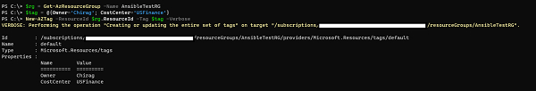 PS C:\> New-AZTag -ResourceId $rg.ResourceId -Tag $tag -Verbose输出