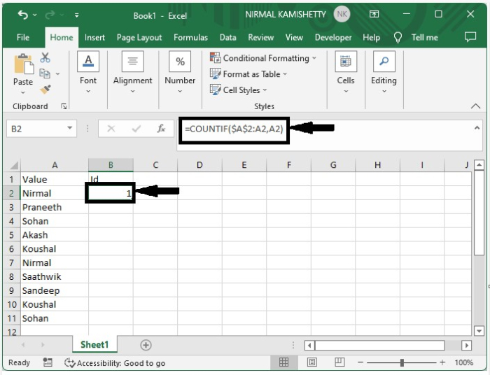 在这里,我们将首先使用COUNTIF公式,然后填写所有结果以获得最终输出。让我们来看一个为重复值分配序列号的简单过程。
