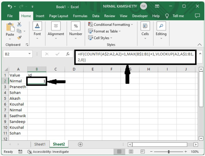 要为唯一值分配序列号,请单击一个空单元格,在我们的例子中是单元格B2,并在公式框中输入公式 =IF(COUNTIF(A$2:A2,A2)=1,MAX(B$1:B1)+1,VLOOKUP(A2,A$1:B1,2,0))。单击“Enter”以获得如下图所示的第一个结果。