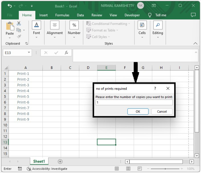 Sub IncrementPrint() 'updateby Nirmal Dim xCount As Variant Dim xScreen As Boolean Dim I As Long On Error Resume Next LInput: xCount = Application.InputBox("Please enter the number of copies you want to print:", "no of prints required") If TypeName(xCount) = "Boolean" Then Exit Sub If (xCount = "") Or (Not IsNumeric(xCount)) Or (xCount < 1) Then MsgBox "error occured, please check value", vbInformation, "no of prints required" GoTo LInput Else xScreen = Application.ScreenUpdating Application.ScreenUpdating = False For I = 1 To xCount ActiveSheet.Range("A1").Value = "Print-1" & I ActiveSheet.PrintOut Next ActiveSheet.Range("A1").ClearContents Application.ScreenUpdating = xScreen End If End Sub