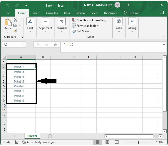 每次打印后,单元格中的数据都会被删除,并且指针会移动到下面的单元格,如下面的图片所示。