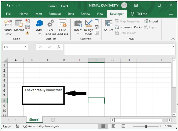 这里,我们将首先创建一个宏,然后将其分配给文本框。让我们看看一个简单的过程,了解如何使用 VBA 应用程序在 Excel 中选中文本框时自动选择文本。我们将使用开发者选项下的 ActiveX 命令按钮。