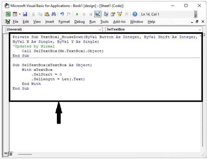 Private Sub TextBox2_MouseDown(ByVal Button As Integer, ByVal Shift As Integer, ByVal X As Single, ByVal Y As Single) Call SelTextBox(Me.TextBox2.Object) End Sub