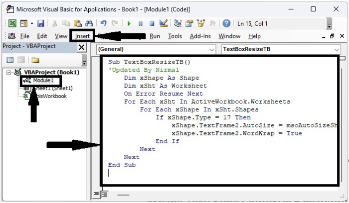在这里,我们将首先插入一个 VBA 模块,然后运行它来完成我们的任务。让我们来看一个轻松的过程,了解如何自动调整文本框大小以适应 Excel 中的内容。