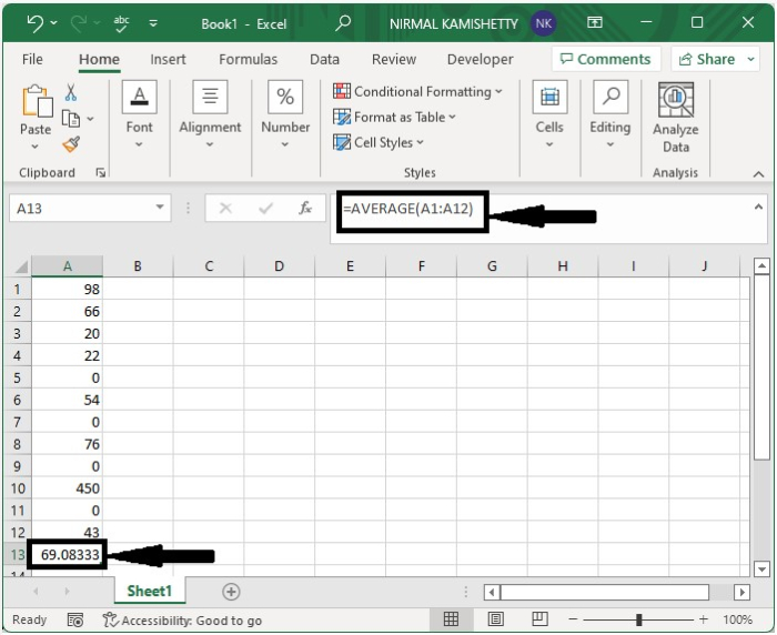 但是在这里,我们需要找到排除零值的平均值。为此,请单击一个空单元格,输入公式 **=AVERAGEIF(A1:A12,"<>0")**,然后按 Enter 键以获得忽略零值的平均值,如下图所示。在公式中,**A1:A12** 是我们工作表中的数字范围。