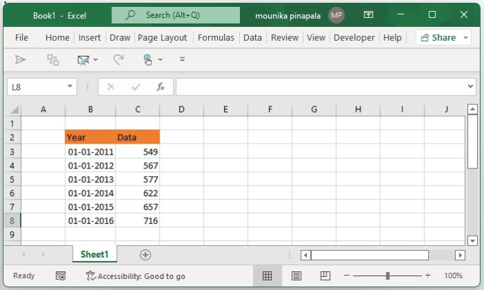 打开Microsoft Excel工作表,并输入如下所示的数据。您可以根据需要更改数据。请参考下面的屏幕截图。